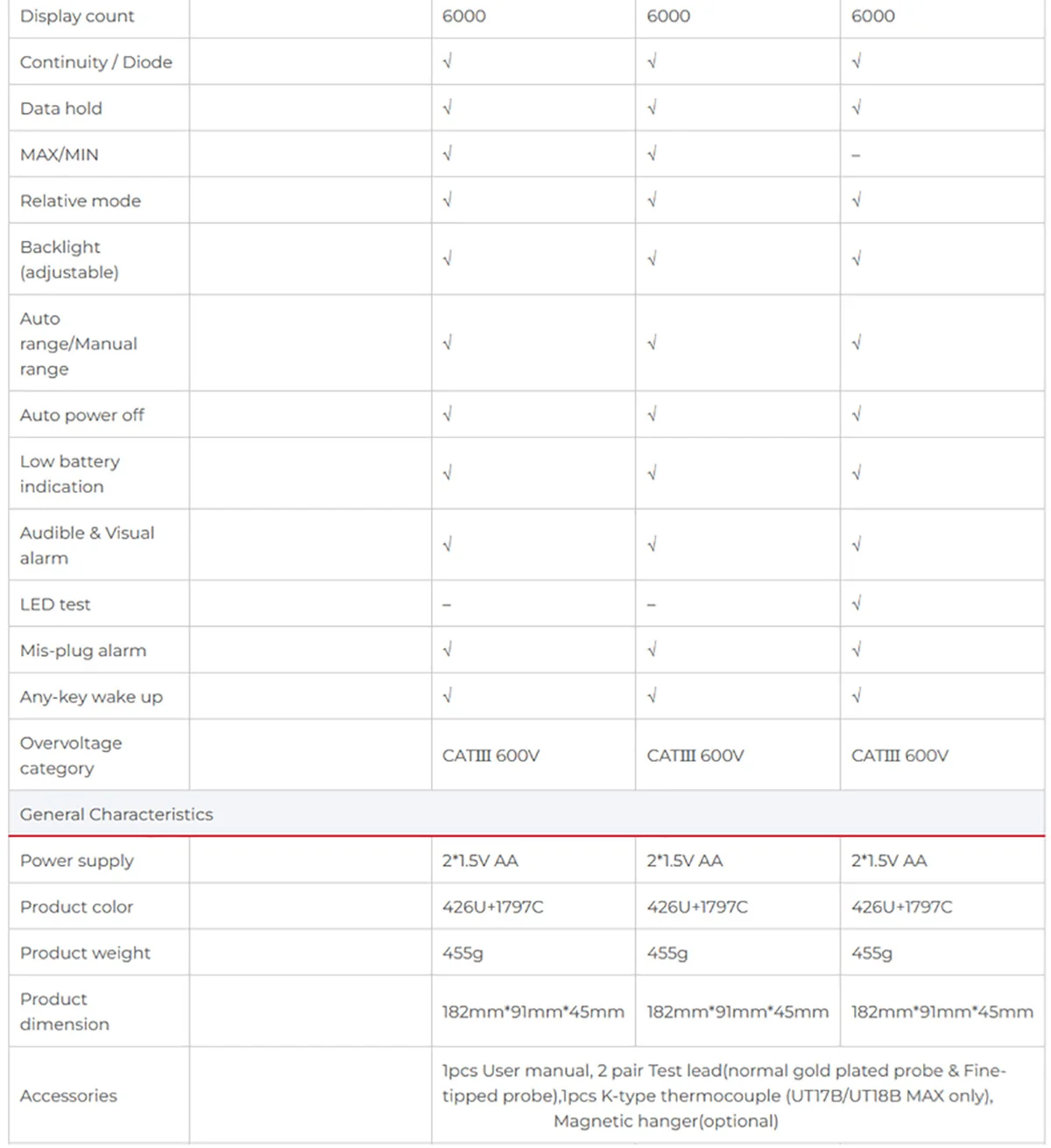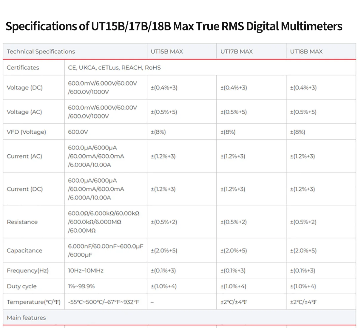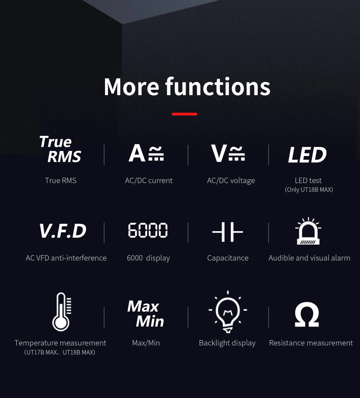 RMAX sorozat:12px. A multiméterek kompakt és hordozható kialakításúak, gyors reagálásúak, erősen zavarják az EMC-interferenciát, és szabványos aranyozott mérővezetékekkel és aranyozott, finom végű mérővezetékekkel rendelkeznek. Teljes tartományú 1000 V-os bemeneti védelemmel is rendelkeznek, amely képes szűrni a szinuszos hullámformákra szuperponált vivőfrekvencia-interferenciát vagy mindenféle feszültségstabilizáló jelet, torzító és feszültségfrekvenciát. átalakító. A frekvencia és a munkaciklus mérése átkapcsolható a DC/AC funkciók között. A CAT III 600V biztonsági szintnek megfelelő termékek a CE, cETLus tanúsítvány megszerzéséhez, ideális eszköz az elektronikai és villamosmérnökök számára.