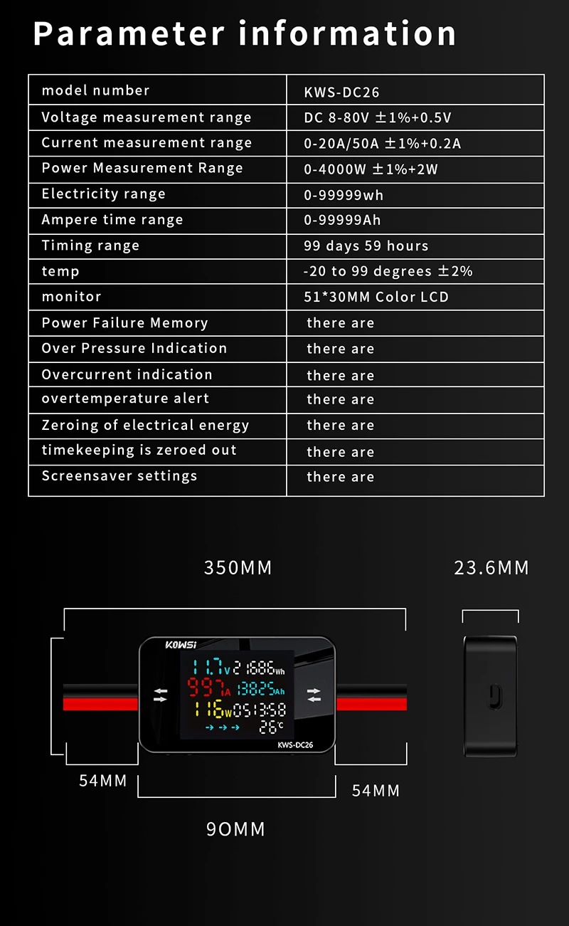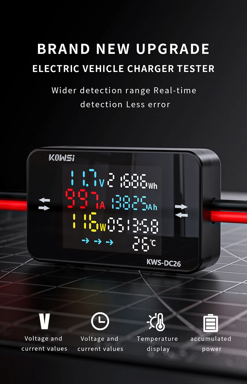 KWS-DC26 DC Power Meter Tester is a high-precision instrument used to measure voltage, current, power, and energy consumption in DC circuits; Suitable for battery performance testing, solar energy system monitoring, electric vehicle charging pile detection and other scenarios. This product features a high-quality LCD screen with various functions such as reporting prompts, bidirectional measurement, data recording, etc. It is easy to operate and highly reliable.
