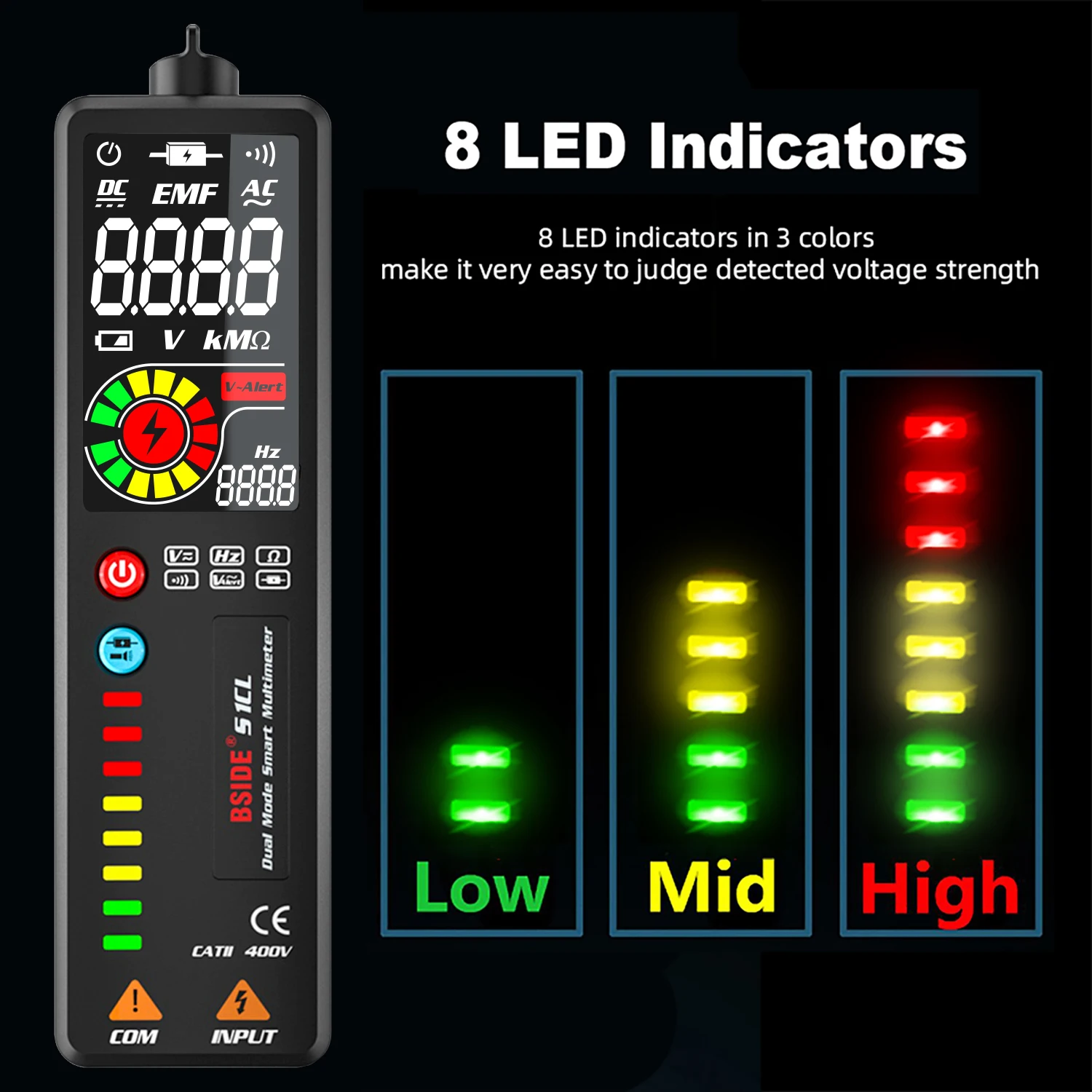 [8 LED Indicators]: 8 LED Indicators in 3 color make it very easy to judge the detected voltage strength.