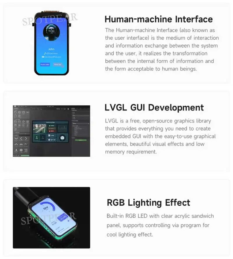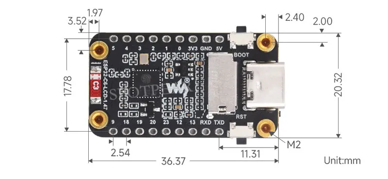 Onboard 1.47inch LCD display, 172×320 resolution, 262K color