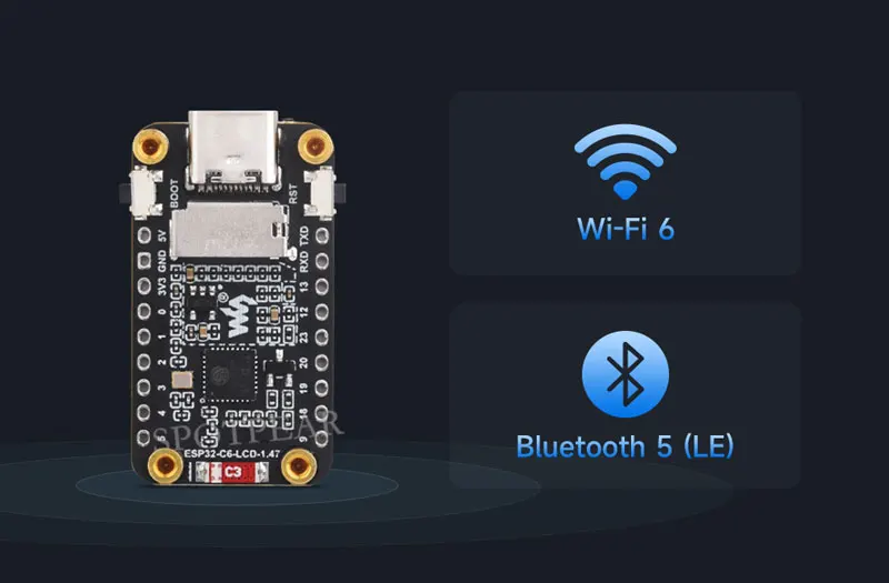 ESP32-C6-LCD-1.47 is a microcontroller development board with 2.4GHz Wi-Fi 6 and Bluetooth BLE 5 support, integrates 4MB Flash. Onboard 1.47inch LCD screen can smoothly run GUI programs such as LVGL. Combined with various peripheral interfaces, suitable for the quick development of the HMI and other ESP32-C6 applications.
