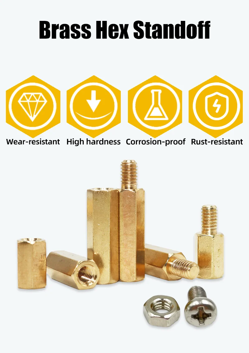 2. [Quality]: Standoff spacers are made of brass, screw, nut are 304 Stainless Steel, have good corrosion resistance. They may be mildly magnetic. The flat sides of the hex ensure a firm grip when tightening with a wrench.