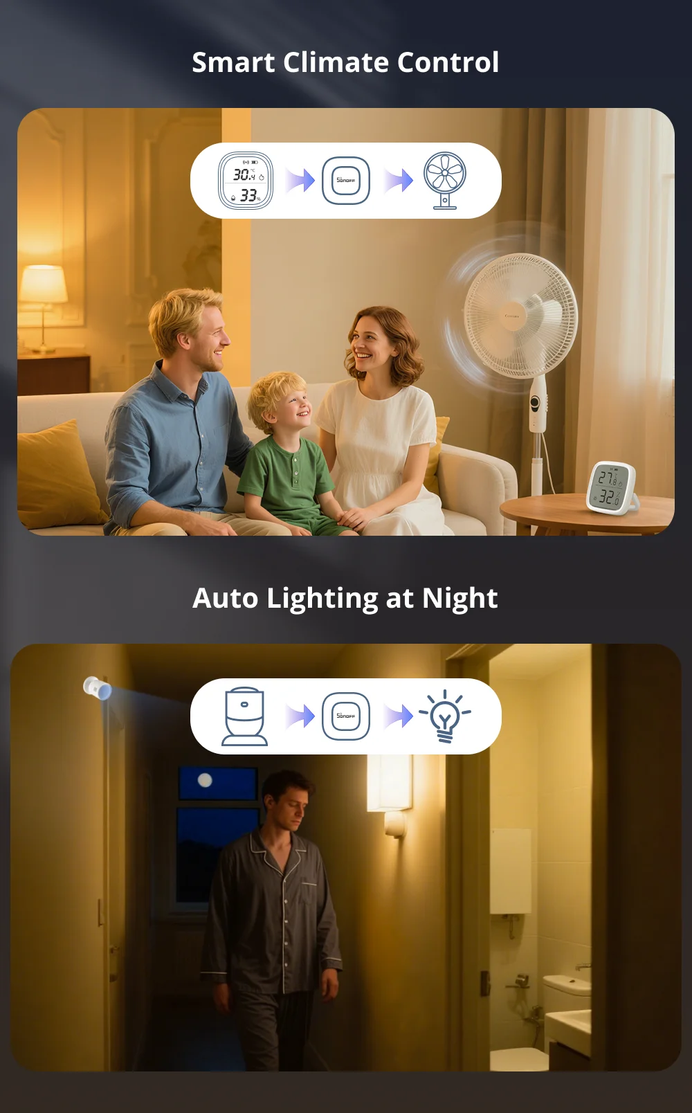Pair with a Temp. & Hum. sensor to automatically turn on the fan when the temperature rises keeping your home comfortable without manual intervention.