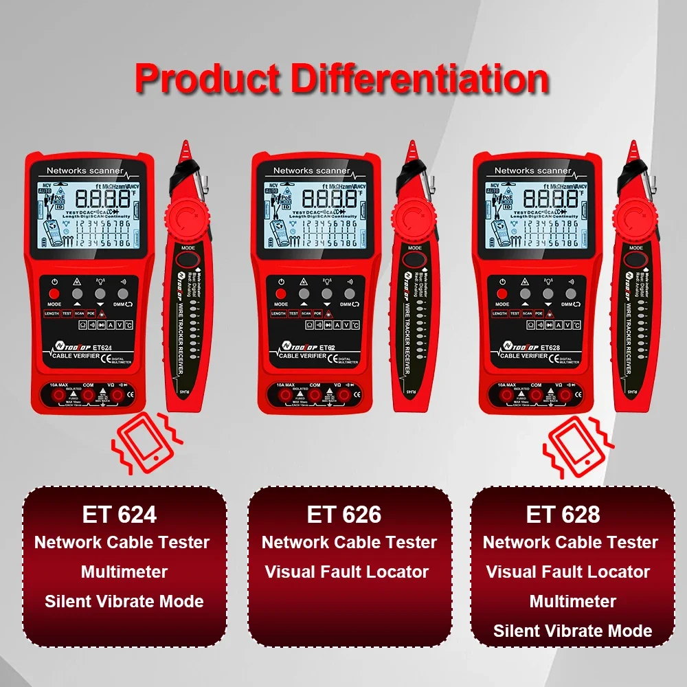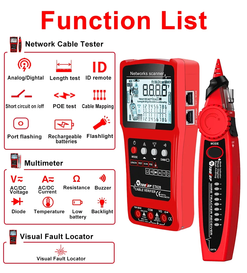 TOOLTOP 3 in 1 LAN Cable Tester Visual Fault Locator Multimeter 600M Length Measure Cable Mapping POE Rj45 Network Cable Tracker