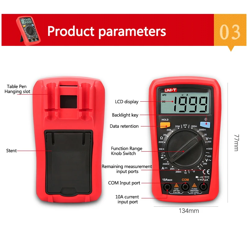 The new generation of UT33+series products redefines the performance standards for entry-level digital multimeters. The new LCD display layout provides clearer display and better user experience. The UT33+series has comprehensively improved the safety standards of the product, ensuring that users can work safely in the CAT II 600V operating environment. UT33B+is an entry-level digital multimeter with battery testing function and a maximum resistance range of 20M Ω; It is the preferred digital multimeter for electricians.