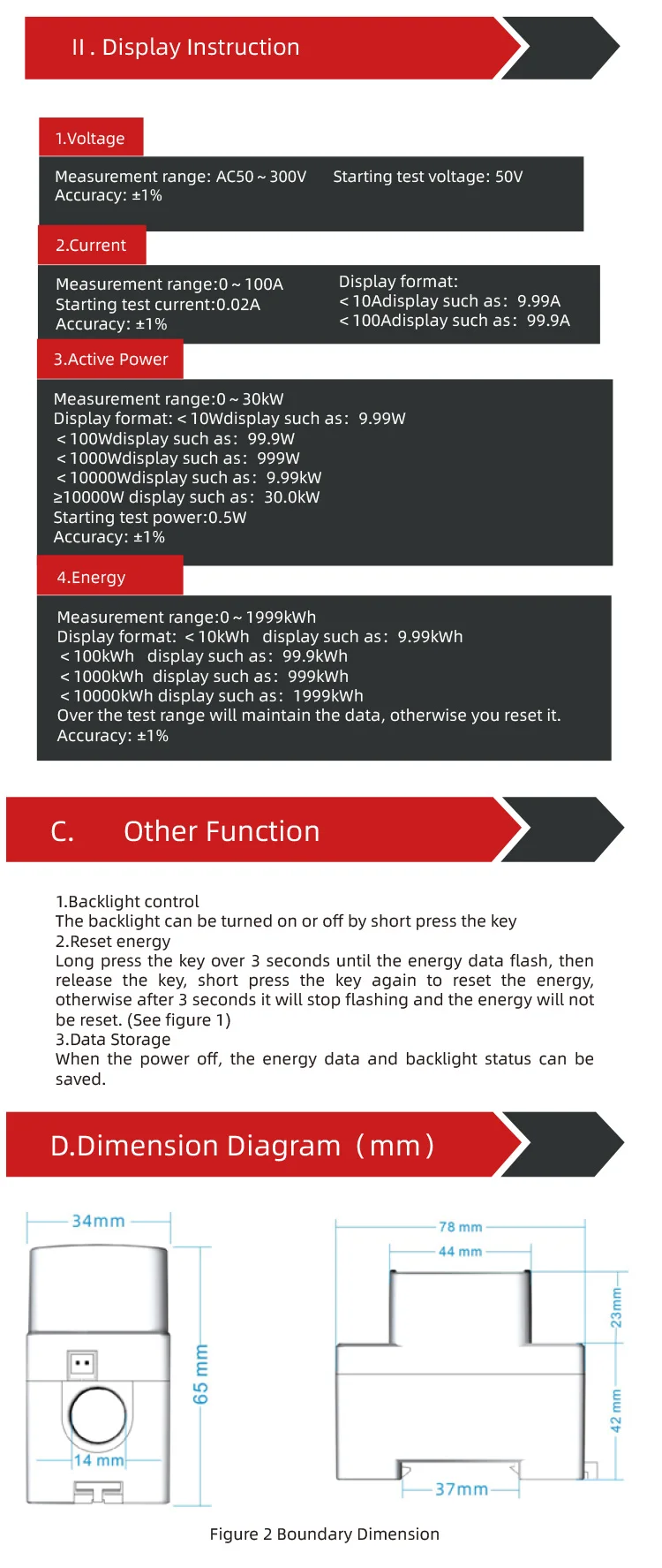 3.Data Storage When the power off, the energy data and backlight status can be saved.