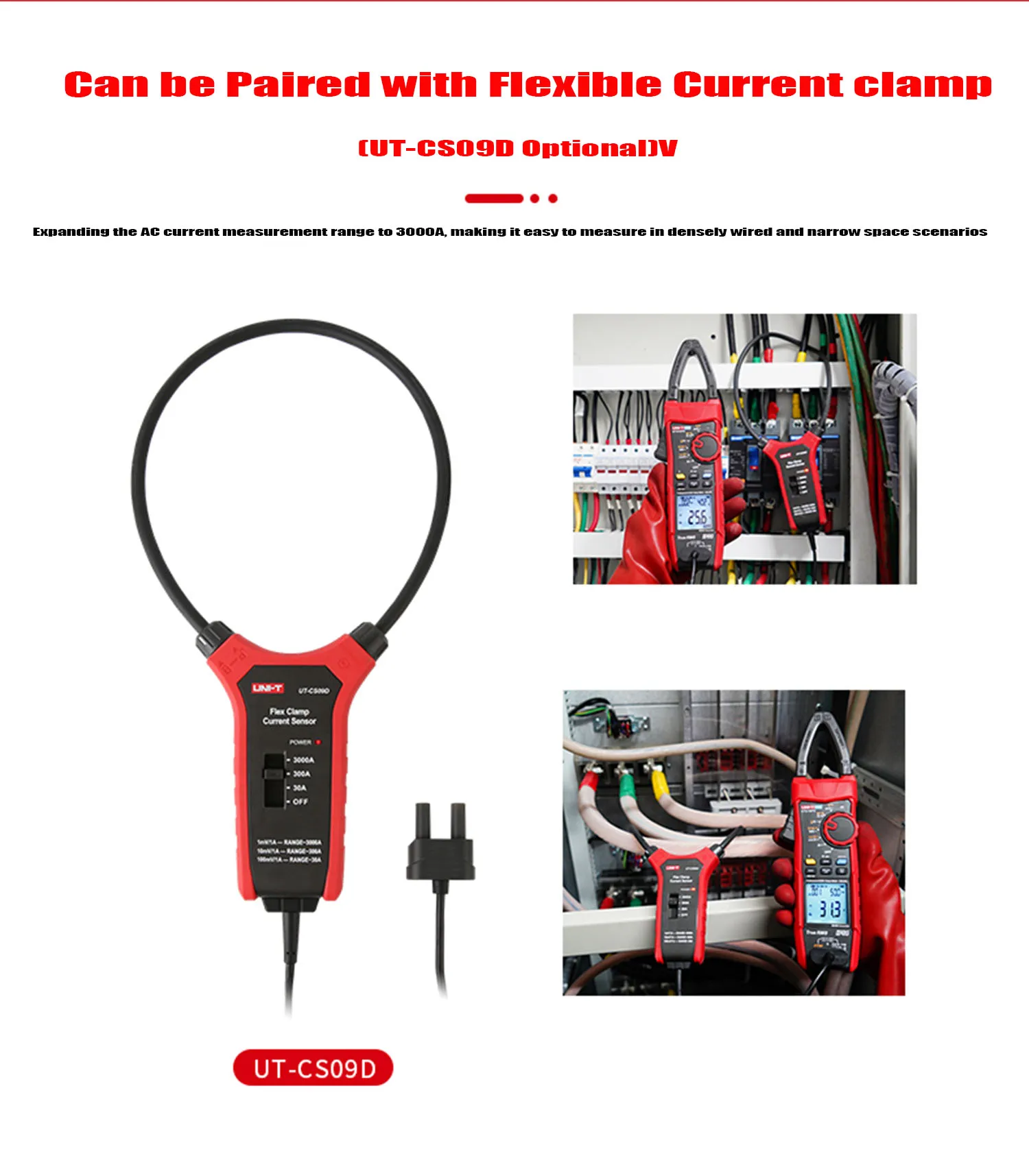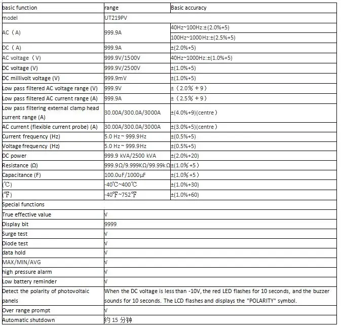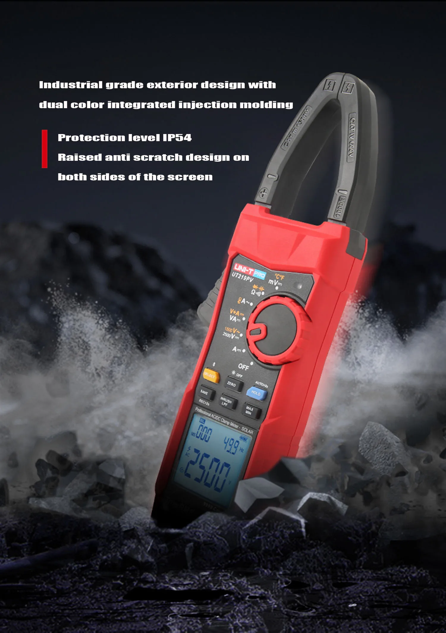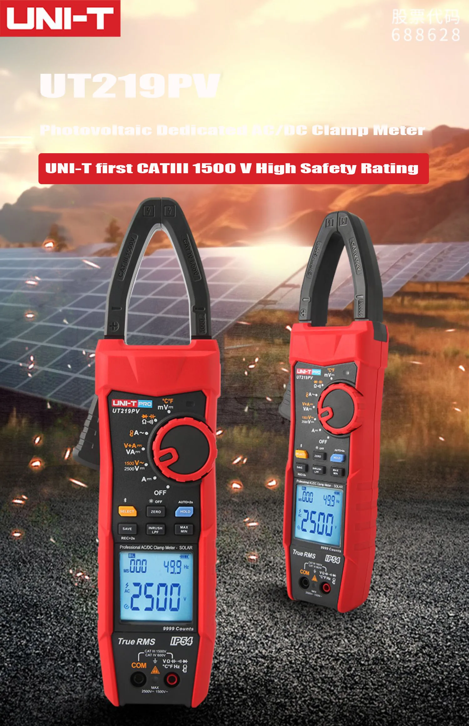 UT219PV is a true RMS photovoltaic dedicated AC/DC clamp meter (hereinafter referred to as clamp meter) designed specifically for photovoltaic high-voltage environments. It has a fully functional automatic range, with a display digit of 9999, and superior performance. It can measure various parameters such as AC/DC voltage, AC/DC current, low-pass filtering voltage/current, surge current, peak current, DC power external flexible clamp, resistance, circuit on/off, diode, capacitance, and temperature. It has a fully functional automatic range, with a display digit of 9999, and superior performance. It can measure various parameters such as AC/DC voltage, AC/DC current, low-pass filter voltage/current, surge current, peak current, DC power external flexible clamp, resistance, circuit on/off, diode, capacitance, and temperature. In addition to being used in photovoltaic scenarios, clamp meters are also suitable for other high-voltage scenarios, such as energy storage systems, UPS uninterruptible power supplies, and large motors.